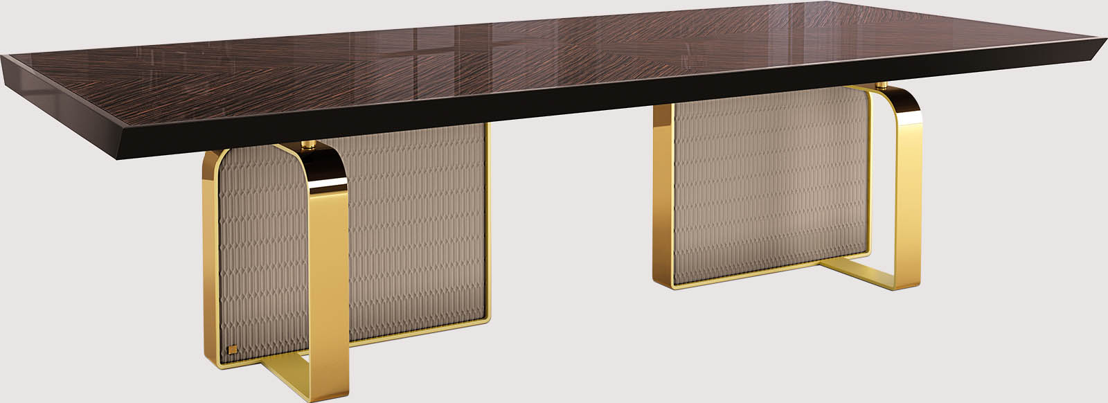Metal and lacquered wood frame. Quilted leather base. Top available in makassar ebony veneer.