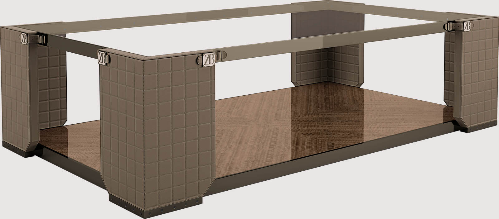 Metal frame. Quilted leather legs. Base available in makassar ebony or eucalyptus frisé veneer. Glass top.