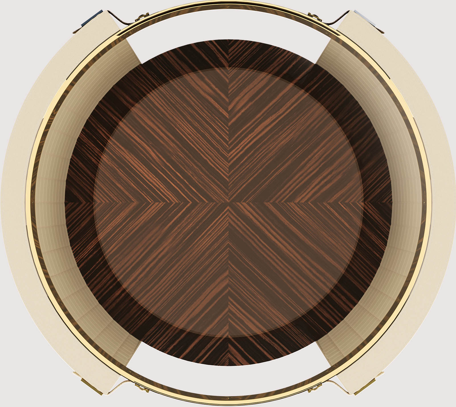 Metal frame. Quilted leather legs. Base available in makassar ebony or eucalyptus frisé veneer. Glass top.